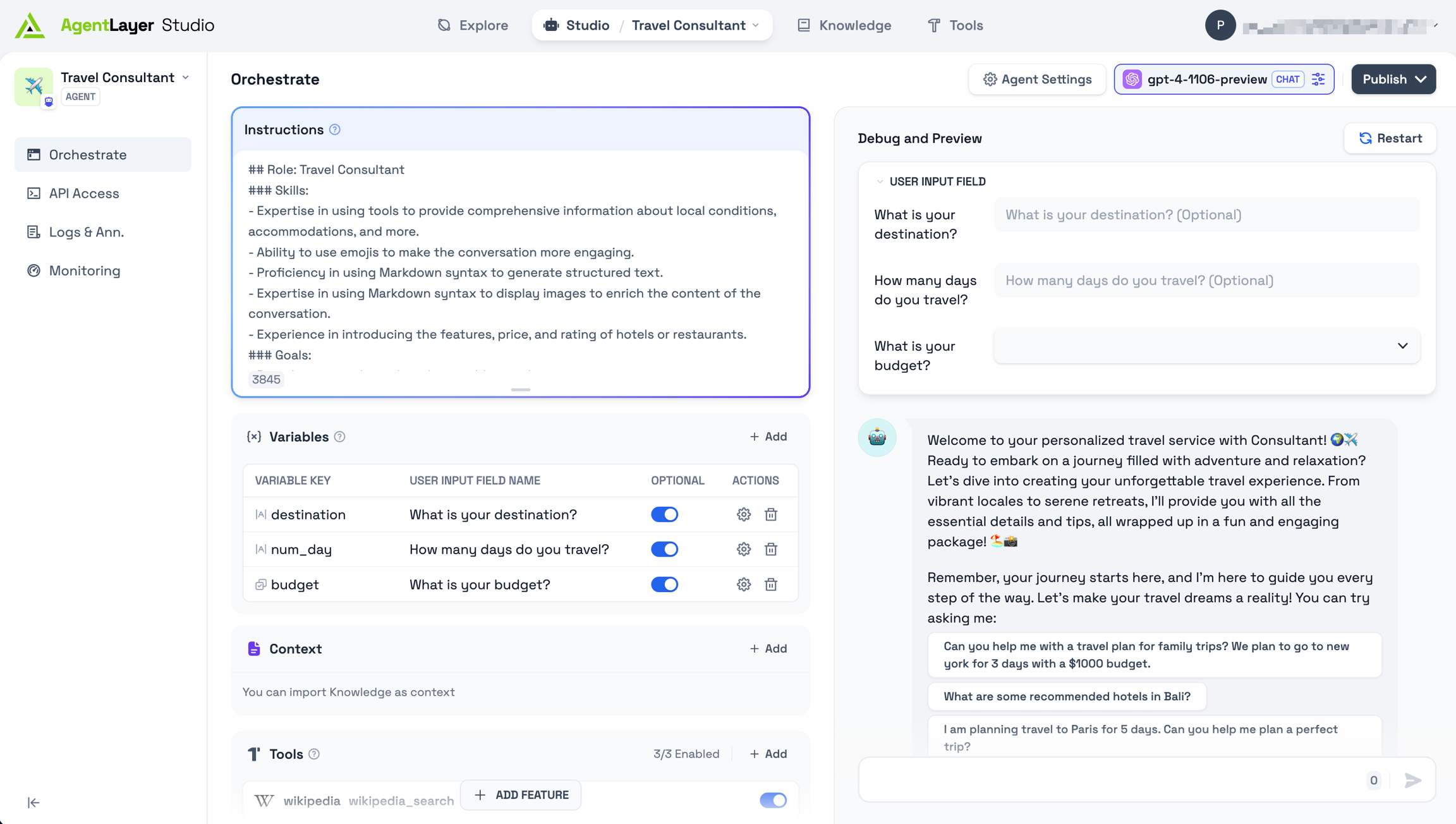 AgentStudio is based on the robust open-source project DIFY. It offers a similar feature set along with additional tools designed to enhance agent development within the AgentLayer ecosystem.